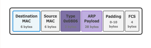 Since the IP address is known, the sender device sends an Ethernet frame that includes the source MAC as the sender’s MAC address, the destination MAC as a broadcast address, and includes an ARP payload in the same ethernet frame. Inside the payload there is the ARP request that includes sender MAC, sender IP, target IP and a target MAC.