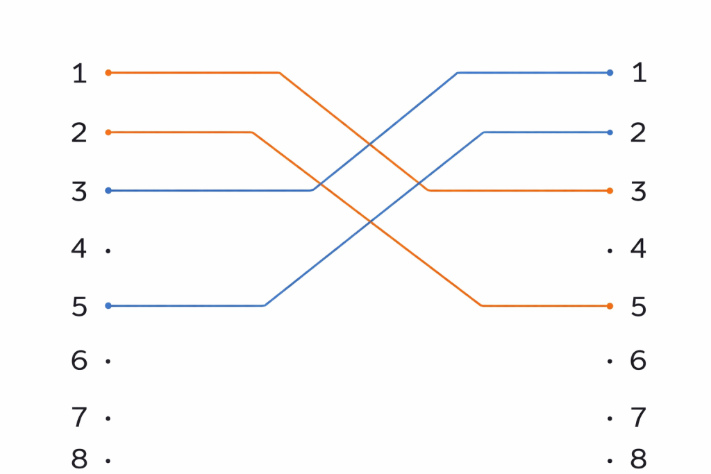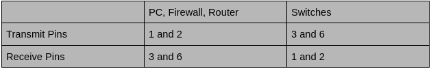 So if a PC is connected to a switch, it will be fine with a straight-through cable as the transmit pins will clearly align with the receive pins perfectly. But what if it was a PC connected to a PC, or a switch was connected to a switch, what would happen? Well as you can guess it would not be any good! The transmit pins would be connected to the transmit pins, and the receive pins would be connected to the receive pins. So basically both PCs will be talking to each other but no one is listening. In other words the PC is talking to a brick wall lol. This is where cross-over cables come to shine in situations like this. The crossover cable crosses(switches) the wire color pairs that are green and orange, so in a T568A cable White Green is at 1 and green is at 2. On T568B White orange is at 1 and Orange is at 2. Because of this setup when a PC is connected to a PC or a switch is connected to another switch, the transmit pins will send traffic to the receive pins. Have a look at the table below to visualize what I just explained.