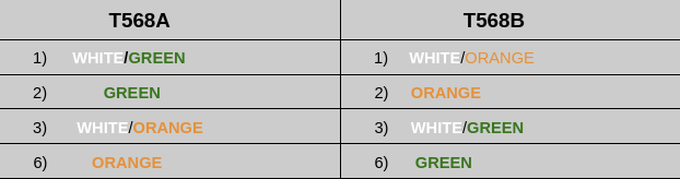 As you can see from the chart above, I have placed only the white and orange pairs so you can visualize what’s happening without any distraction from the other colors. To be technically correct, I want to emphasize that what I am about to say applies to speeds of 10/100 Mbps ONLY. (In this example, only two color wires are chosen when it comes to 1000 Mbps all four color wires will be transmitting and receiving simultaneously.) It operates differently at speeds higher than that but for the sake of learning A and B functions will only be talking speeds 10/100 Mbps. As you can see in the chart white/green is at 1 and green is 2. On the other end white/green is at 3 and 6 is green. White/green and green will transmit and white/green and green on B will receive. Same goes for T568B, white/orange and orange will transmit and white/orange and orange on the other side will receive. Remember PC transmits on 1 and 2 and receives on 3 and 6, this is what makes the crossover cable work.