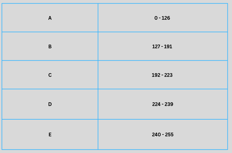 Hi, today I am going to dive into the classful addressing and classless addressing and their differences. Before classless IP addressing, there was rigid classful addressing. By classful, I mean that there is a block of fixed addresses per network, and the leading decimal had to be within a certain range as well. Let’s start with the leading range, but first it’s important to know that there are 5 classes. Classes A, B, C, D, and E. Each of these define the leading decimal, the number of networks(subnets) and the numbers of addresses per network(subnet). Class A ranges from 0 – 126, B ranges from 127 to 191, C from 192 to 223, D from 224 to 239 and E from 240 to 255. I put a chart down below.