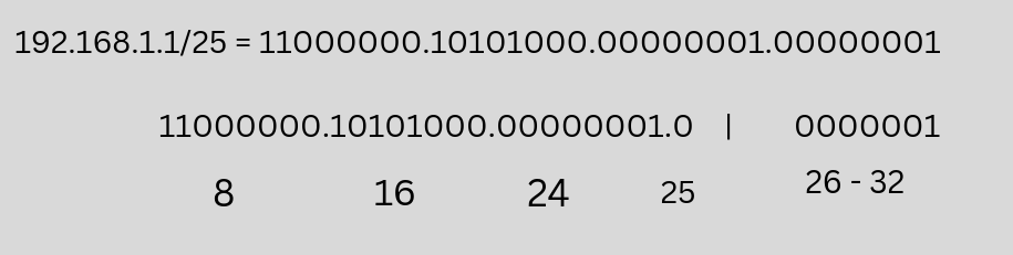 Another example shows what it would look like if the slash notation is /25. The first 25 bits are the network portion and the remaining are the assignable addresses.