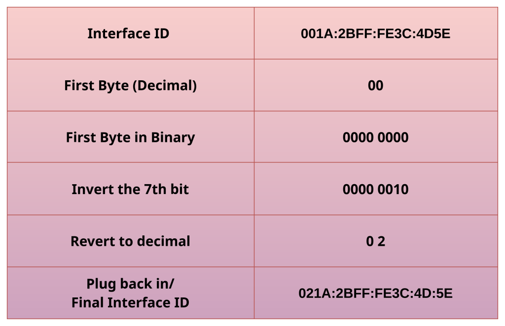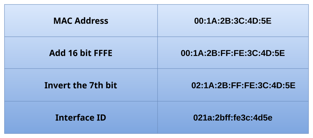 Today I am going to talk about EUI-64 (Extended Unique Identifier 64-bit). IPv6 is a little different from IPv4 because not only does it have DHCPv6, it also has a feature called SLAAC (Stateless Address Autoconfiguration) which can use EUI-64. SLAAC is used to automatically generate an IPv6 address, and EUI-64 is used to automatically generate the interface ID portion with only the device’s MAC address. It does this in 3 simple steps: