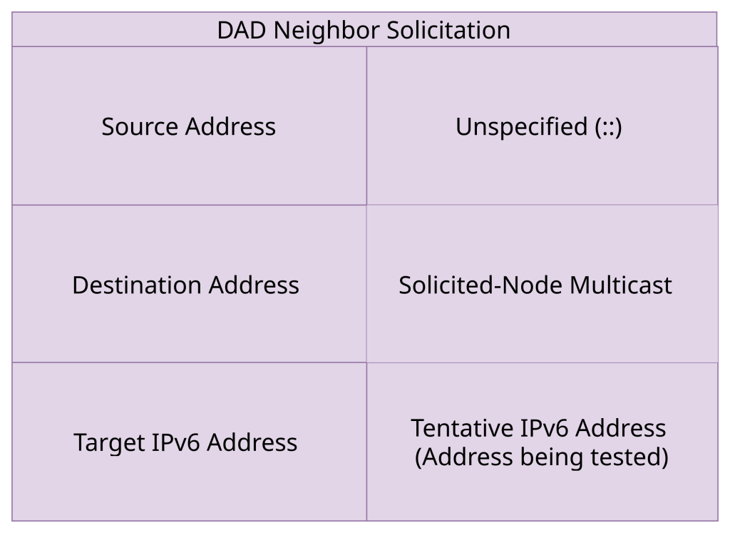 When a device is assigned an IPv6 address, the device uses DAD to ensure that the IPv6 address is not already in use before the device begins using it. When an IPv6 address is first assigned that specific IPv6 address is placed in a “tentative” state. This means that the address cannot be used to send any packets using that address. When the tentative address is assigned a NS packet is then created. The source address of a DAD NS is an unspecified address (::), the destination address is the solicited-node multicast address of the tentative IPv6 address, and the target IPv6 in the payload is the tentative address again. The message is then sent, and the device will wait for a certain period called the “RetransTimer.” The Retrans Timer is usually 1 second but it can be manually configured to something else. If a device is already using the tentative address, it will send an NA within that interval. If an NA is received, that address will be marked duplicate and will not be assigned. If a NA message is not received within the Retrans Timer, then the device will move from a“tentative” state to a “preferred” state and will officially be assigned to the interface.
