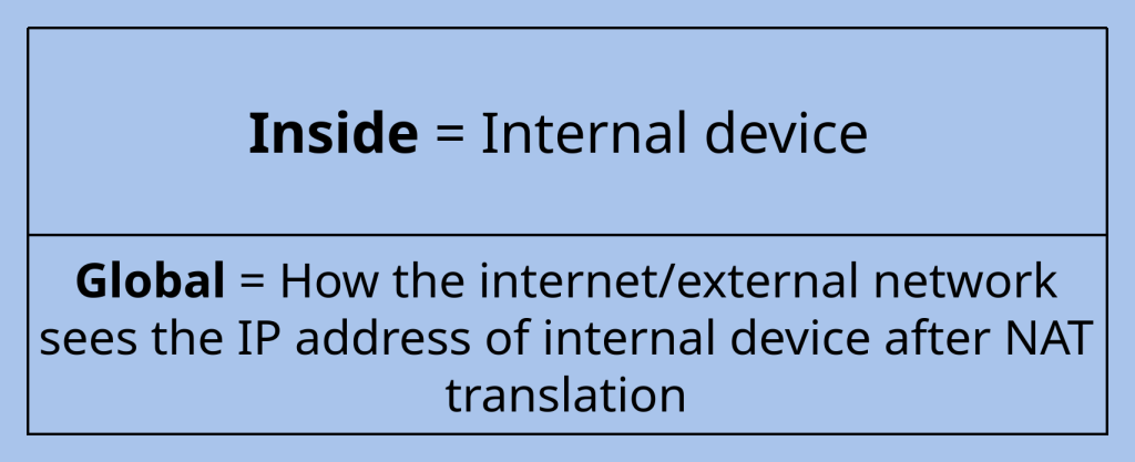 2) Local/Global = Refers to the side of the NAT router at which the IP address is being viewed from.