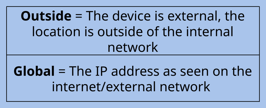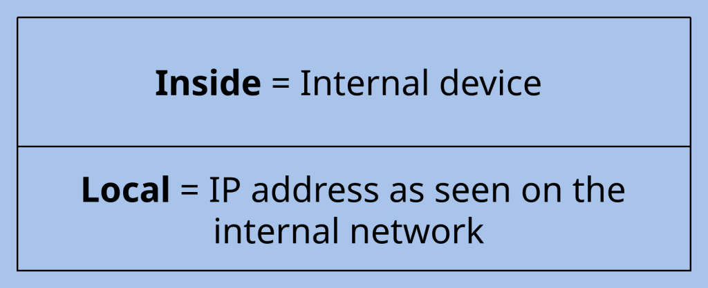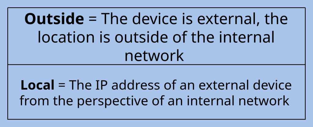 Outside Local- An outside local address is the IP address of an external device as it appears to the internal network. This is how an IP address looks from the perspective of internal hosts or devices.
